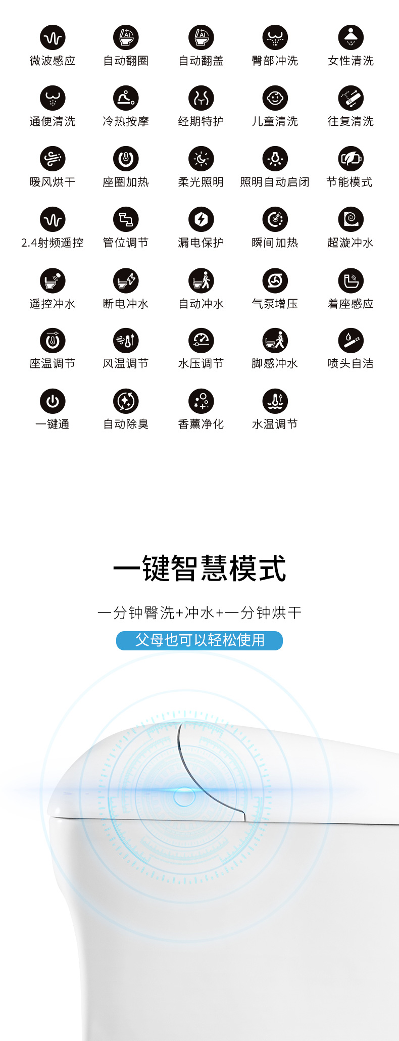 產(chǎn)品功能:1、微波感應(yīng)、自動(dòng)翻蓋/翻圈、