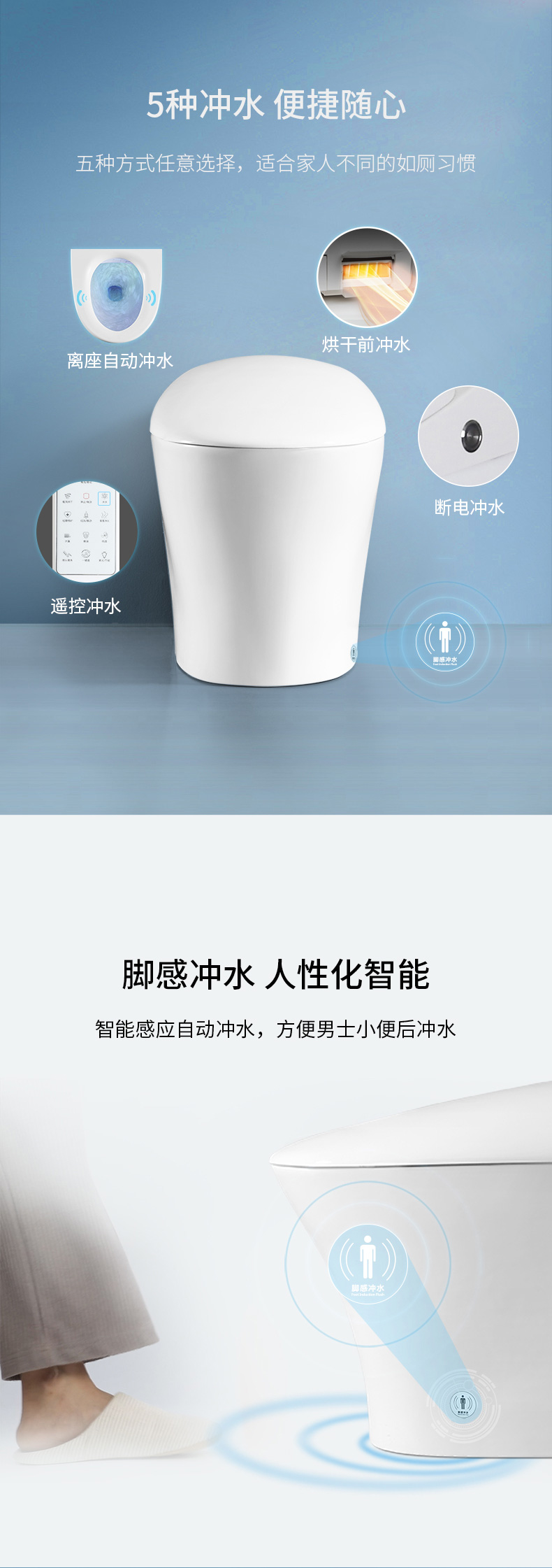 5、腳感沖水、離座沖水、遙控沖水、停電手動(dòng)沖水、